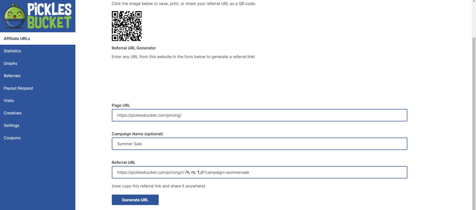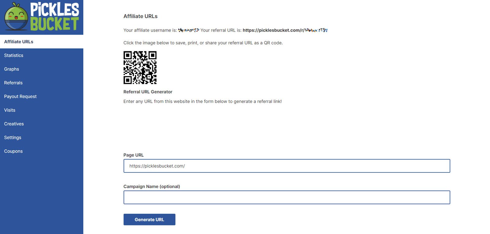 By default you will find PicklesBucket homepage on the top with your affiliate URL as well as the QR code to the homepage including your affiliate URL.